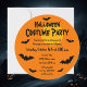 Party Einladungen für Kinder und Erwachsene. Eigene Einladung für Kinderkostüme Party, Kürbisschnitzernacht, Geburtstag und Trick oder Gaumen im Herbst. Hübsches schwarz-orangefarbenes Design mit schwarzen Fledermäusen und Vollmond-Dekoration. Personalisierter Text mit beängstigenden Typografie-Buchstaben. Dekoration. Fun Circle geschnitten Form Design geeignet für Jungen und Mädchen. Erstellen Sie einfache Rundladen für Zuhause, Büro, Schule etc.