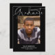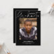 Diese minimalistische Abschluss-Fotokarte zeichnet sich durch ein einfaches Design mit informellem Skript aus. Auf der Vorderseite ist "Graduate" in lässiger Kalligrafie über die Oberseite geschrieben, mit einem großen Foto darunter. Fügen Sie unten den Namen, die Schule und das Jahr des Abschlusses hinzu. Die Typografie ist weiß vor einem farbigen schwarzen Hintergrund. Auf der Rückseite der Abschluss-Karte befindet sich eine optionale Vorlage zum Hinzufügen von Gruppenangaben für Graduiertengruppen.