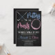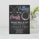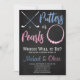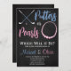 Niedliche Putter und Perlen Geschlecht offenbaren Party Einladungen. Ein einzigartiges Design mit einer blauen Golftasche und Schlägern mit weißen Perlen auf einem Kalkboard-Hintergrund.