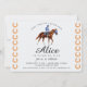 Modernes Race Horse Derby Party Reitsportal Einladung Modernes Pferderennen Derby Party Einladung mit einer Darstellung eines Rennpferdes mit Jockey und gestreiftem Muster auf der Rückseite. Alle Textelemente können so geändert werden, dass sie auch für andere Veranstaltungen genutzt werden können: klassische Reitferien-Einladung, Pferdegeburtstag-Party, Derby-Party, Stallöffnung und vieles mehr. Hintergrund, Farbe der Illustration und Textfarben können mit dem Designwerkzeug geändert werden!