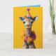 Eine charmante Babygiraffe, gekleidet für eine Feier, mit einem festlichen Party mit farbenfrohen Motiven und flauschigen Dekorationen. Die Giraffe ist ein flauschiges, buntes Federboa und steht vor einem hellgelben Hintergrund und schafft so eine fröhliche und skurrile Szene.