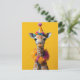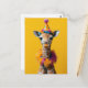 Eine charmante Babygiraffe, gekleidet für eine Feier, mit einem festlichen Party mit farbenfrohen Motiven und flauschigen Dekorationen. Die Giraffe ist ein flauschiges, buntes Federboa und steht vor einem hellgelben Hintergrund und schafft so eine fröhliche und skurrile Szene.