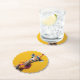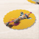 Eine charmante Babygiraffe, gekleidet für eine Feier, mit einem festlichen Party mit farbenfrohen Motiven und flauschigen Dekorationen. Die Giraffe ist ein flauschiges, buntes Federboa und steht vor einem hellgelben Hintergrund und schafft so eine fröhliche und skurrile Szene.