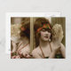 Fotografie um 1920 eines hübschen Mädchens mit straffem Kleid, Perlen um ihren Hals und einem Stoffband in ihren Haaren. Sie hält einen Elfenbeinventilator und lehnt sich vor einem Spiegel.