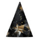 This party hat is shown with a black and gold sparkle stars print.