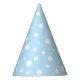 Partyhut wird in einem niedlichen hellblauen und weißen Polkapunkt-Druckentwurf gezeigt.