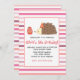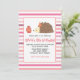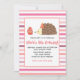 Eine Party Einladung aus niedliche Geburtstag mit rosa gestreiftem Hintergrund, mit einem Igel, der einen Party mit Erdbeerkuchen trägt.