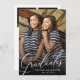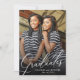 Moderne Doppel-Absolventen Graduation Party Einladung. Design zeigt Single Foto von zwei Absolventen auf der Vorderseite, Typografie Drehbuch ''Absolventen'' in trendy weiße Schrift, Namen und Klasse von. Personalisieren Sie weiter mit Party Details und 2 zusätzlichen Fotos, Schule/Uni/Universität Details und Dur auf der Rückseite.