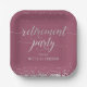 Diese eleganten und festlichen Ruhestandspapier-Teller verfügen über silberne (simulierte Folie) Konfetti mit passenden Buchstaben, die "Party für das Ruhestand" in einem wunderschönen Skript-Schriftart sagen. Die Hintergrundfarbe ist in Rosa / Rose gehalten, kann aber in eine beliebige Farbe geändert werden.