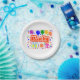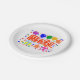 7" Runde Pappteller = optional, mit einer Zeichnung/Gestaltung des Wortes = Party, in der Farbe Rot und Weiß, mit einigen farbenfrohen Luftballons, Konfetti und Geschenkpaketen, = (Zeichnung/Design von P. J.M.) = darauf.