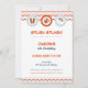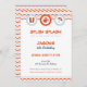 Moderne Beach Party oder Pool Party Einladung in orangefarbenem und hellblauen Stil mit Bildern zum Thema Strand und einem Zickzack Hintergrund. Ideal für einen Sommer Geburtstag.