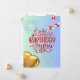 Front: Die Karte hat einen hellblauen Hintergrund. In der Mitte steht ein großer roter Text mit dem Titel "Happy Birthday to You", der mit weißen und roten Sternen dekoriert ist. Über dem Text befinden sich zwei weiße Feuerwerke, die verstreut sind kleine Sterne. Rechts gibt es zwei Geschenkboxen mit roten Bändern, und in der unteren links Ecke befindet sich ein goldener, herzförmiger Ballon. Zurück: Es gibt eine leicht gedruckte Geschenkboxen und einen Teddybär, zusammen mit den Phrasen "Wir wünschen Ihnen alles Gute" und "machen Sie einen Wunsch und feiern Sie Ihren besonderen Tag" in einem eleganten Schriftart.