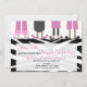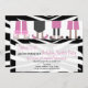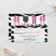 Eine Party Einladung zum Geburtstag, in der vier Fußpaare mit Flamingo, Bär, Katze und Hausschuhen dargestellt werden. Pajamas haben ein rosa und graues Farbschema. Hintergrund ist Zebradruck. Personalisieren Sie den Text.