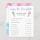 Whimsical Eis Thema Geschlecht zeigen Party-Spielkarte mit Aquarellbildern von Rosa und Blau Eis auf einem Waffelkegel. Die Texte sind bearbeitbar. Perfektes Spiel während der Dusche. Es listet Babynahrung auf und frage den Gästen, den Preis zu erraten. Wer den Preis am nächsten schätzt, gewinnt!