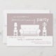 Eine häusliche Party Einladung mit einer Abbildung eines weißen Wohnzimmers mit Sofa und auf beiden Seiten einem Tisch. An den Endtischen befinden sich eine Lampe und eine Vase von Blume. Hintergrundfarbe und Textfarbe sind anpassbar.