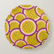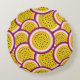 Almofada redonda com ilustração de fatias de maracujá.