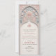 Diese Hochzeitseinladung besticht durch ihre pastellfarbene Eleganz und eine weiche Farbpalette, die zeitlos die Gnade islamischer Architektur mit zeitgenössischen Designsensibilitäten verbindet. Die Vorderseite der Karte ist mit einem friedlichen islamischen Bogen geschmückt, der mit kunstvoll geschnitzten Blumenmustern in Rosa, Blau und Weiß in dezenten Blau aufblüht, was an die Kunstwerke eines friedlichen Gartens erinnert. Ein Imitat Goldfolienkalligrafie von Bismillah fügt eine Touch von spiritueller Bedeutung hinzu, während die raffinierte Schriftart-Auswahl für den Text das luftige Gefühl des Designs ergänzt. Diese exquisite Einladung ist ideal für Paare, die Tradition und moderne Eleganz in ihren Hochzeitsfeiern verbinden möchten.