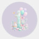 Elegant round first birthday sticker in a soft pastel fairytale style with a delicate number one illustration and dreamy lilac palette. Perfect for envelope seals, favor bags, party stickers, and sweet one birthday decorations for a girl’s first birthday celebration.