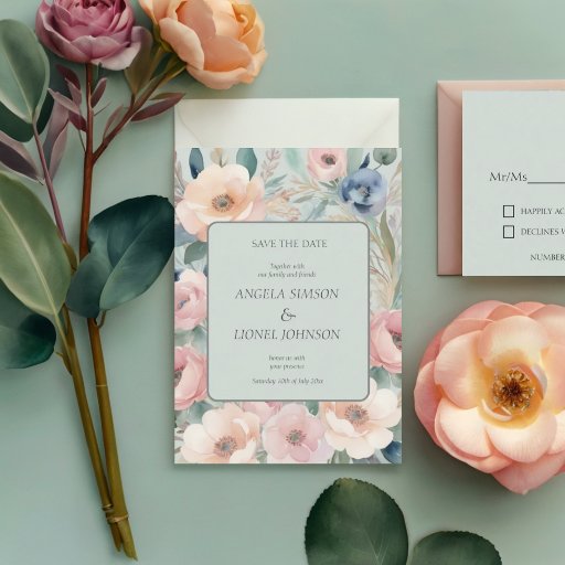 Dieses Hochzeitsdesign besticht durch eine delikate Anordnung pastellfarbener Aquarellflorale, zu denen auch Rosa und Blau zählen. Die luftige und elegante Komposition schafft eine romantische und zeitlose Atmosphäre, perfekt für moderne oder traditionelle Hochzeiten. Dieses Design verströmt Charme, Anmut und Eleganz für Ihren besonderen Tag. CADE Design © Sie können mit Ihren Namen und Text personalisieren. Sie können Textfarbe und Schriftart-Stil ändern, indem Sie die weitere Option anpassen. BITTE BEACHTEN SIE: Die online angezeigten Farben können leicht vom aktuellen Produkt abweichen.