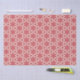 Das Muster weist ein symmetrisches, sich wiederholendes Design mit einem fetten Blumenmotiv auf. Es besteht aus zwei Hauptfarben: tiefes Korallenrot und hellrosa. Das zentrale Element ist eine große, stilisierte Blume mit sechs Blütenblättern in Korallenrot. Um diese Blume herum sind weitere geometrische Formen, darunter Blütenformen und polygonale Formen, die ein ausgewogenes und harmonisches Design schaffen. Der hellrosa Hintergrund bildet einen weichen Kontrast, der die korallenroten Formen hervorhebt.