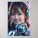 Eine junge Frau mit einem hellen Lächeln ist futuristisch gekleidet, mit neonbeleuchteten Kopfhörern und einem Hightech-Anzug. Sie scheint sich in einer Science-Fiction-Umgebung zu befinden, in der leuchtende Lichter die lebendige Atmosphäre verstärken.