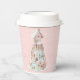 Das Design des Papierbechers besticht durch eine trendige Pastell-Lebkuchenschloss aus 4 Schichten Kochhäusern. Die Farben sind hellrosa, hellblau und hellgrün und bräunen auf einem rosa Hintergrund mit weißem Schneeflockenmuster.