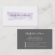Elegante und einfache Visitenkarten für Fotografen oder jeden Beruf bieten eine schöne graue Kalligraphie-Schrift mit einem Schweiß von Aquarell in Pastelllavender lila. Fügen Sie Ihre Kontaktdaten auf der Rückseite in weißer Schrift auf grauem Hintergrund hinzu.