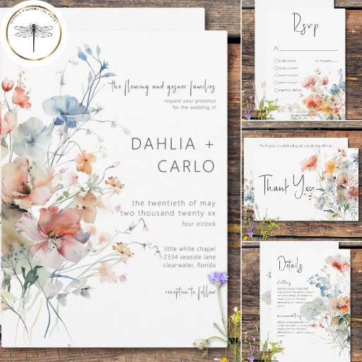 Feiern Sie Ihren besonderen Tag mit unserer atemberaubenden, rustikalen Hochzeitskarte mit einem zarten Aquarellbukett lockerer Wildblumen in sanften Pastelltönen in Blau, Rosa, Pfirsich und Gelb. Jedes Design ist ein Kunstwerk, das das romantische Wesen der Schönheit der Natur einfängt. Diese Hochzeitssuite ist perfekt für eine Hochzeitsfeier im Frühjahr oder im Sommer geeignet und Set den Ton für eine fröhliche und elegante Feier. Erstellt von der einfachen Farmhouse Press.