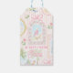 This Christmas gift tag features pastel nativity scenes of baby Jesus sleeping in a manger with Mary and Joseph, three wise men and angels. There is a light pink striped background.