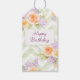 Add an elegant finishing touch to any birthday gift with these pastel watercolor floral gift tags featuring soft peach roses, lavender blossoms, and delicate greenery layered over a sage green chevron background.
