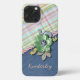 Zeitgenössisches Rosa, hellblau, Limettengrün, Aqua-Türkis und violett lila diagonales Tartan kariertes Muster auf einem blauen Jeans denim Stoff aussehen. Mit Raum zum Personalisieren oder anpassen mit einem Namen, Initialen oder Monogramm Ihrer Wahl. Schönes, modernes und cooles Cover für den Trend-geschickten und kunstliebenden angesagten Trendsetter, künstlerischer Motif-Liebhaber, der will, ihr Handy vor Staub und Schmutz, Abnutzung und Tränen zu schützen. Dieses Design ist erhältlich in Apple iPhone 6, 7, 8, 10 oder X, XR, XS, 11, 12, 13 Mini, 14, 15 Plus, und Pro Max Handy Hüllen. Zeigen Sie Ihren Stil, sehen Sie in der Mode und fühlen Sie sich stilvoll mit einem einzigartigen Design auf einem mobilen Zubehör Ihrer Wahl.