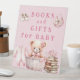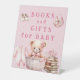 This baby shower pedestal sign features a whimsical teddy bear sitting in a white wicker basket. She's surrounded by a sweet outfit, sneakers, a bib, a stack of books and of course a little crown for the Princess. Background is a pink with white polka dots pattern. Set this up on a table at the baby shower and everyone will know exactly where to put their gifts.