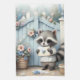 A gentle cottagecore scene unfolds as a wide-eyed raccoon stands before a pale blue garden gate, holding a flower-tied letter as blossoms spill softly from woven baskets. The mood is tender and storybook sweet, blending whimsical charm with pastel florals, warm woodland character, and a dreamy watercolor glow. The soft blues, blush pinks, and airy neutrals create a serene, heartwarming aesthetic that feels like a quiet moment of magic waiting to be shared. AI generated artwork.
