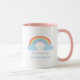Eine Tasse mit einem pastellfarbenen niedlichen Regenbogen und seinen zwei blauen Wolken. Sie können es mit einem Namen und einem Text personalisieren. Es wird perfekt als Geschenk des Lehrers oder für den Muttertag!