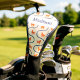 Bring a peaceful retro vibe to your game with this stylized pattern. This personalized golf head cover features multiple pastel orange Golden Retriever silhouettes and blue-grey wavy lines on a cream background. It is the perfect blend of minimalist design and whimsical charm, making it a sophisticated choice for any dog mom on the green. As a unique gift for a Golden Retriever lover or golf enthusiast, you can customize this durable cover with your name for a truly personal touch. High-quality print and clean aesthetic for the modern dog lover.