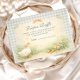 Ein charmantes, märchenhaftes Babyshower-Design mit einer süßen Wasserfarben-Gans, die neben einem Nest mit pastellfarbenen Eiern steht. Zarte Frühlingsblumen und sanftes Grün schaffen eine idyllische ländliche Szene, während eine rosafarbene Schleife und ein Hintergrund mit Salbei-Gingham einen gemütlichen Cottagecore-Touch hinzufügen. Der vintage-illustrative Stil und die weiche Pastellpalette verleihen diesem Design eine verspielte, nurserieske Atmosphäre, perfekt für eine fröhliche und herzliche Babyparty.