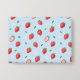 Ein spielerisches Muster mit handbemalten Erdbeeren, kleinen weißen Blume und grünen Blätter auf hellblauem pastellfarbenem Hintergrund. Ideal für Produkte mit Federdesign oder niedliche Stoffdrucke.