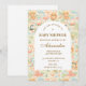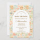 A whimsical watercolor design featuring a playful mix of pastel summer animals surrounded by tropical leaves, seashells, starfish, and soft botanical details. The cheerful palette of peach, mint, coral, and soft blue creates a light storybook atmosphere, while the elegant arch layout keeps the celebration details beautifully framed and easy to read. Perfect for a warm, joyful summer celebration with a charming nursery aesthetic.