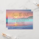 Save the Date die Wedding Card bietet wunderschöne Pastellfarben des Sonnenuntergangs am Strand. Türkisblaue, lila und orangefarbene Sonnenuntergangsfarben sorgen für eine erstaunliche Mischung aus tropischen Schattierungen für ein Thema wie Strand, Ozean, Kreuzfahrt oder Sonnenuntergang. Wunderschöne Idee für die Planung eines paradiesischen Hochzeitsfestes am Strand in einem Inselresort mit diesem schönen Design. Berge Silhouette, glitzernder Sonnenuntergang bei Dämmerung, sanfte Wellen und Strand Sand am Meer, perfekt für ein Ziel, Insel, tropisches Paradies Küste nautische Veranstaltung. Teilen Sie Ihre Hochzeit auf der karibischen Insel oder auf dem tropischen Strand.