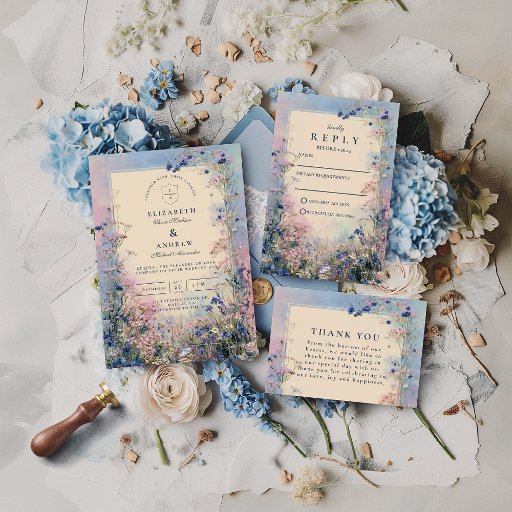 A dreamy watercolor wedding design featuring delicate wildflowers in soft shades of pink, lavender, and blue. The gentle pastel tones and painterly details evoke the romance of an open meadow at sunrise. Perfect for spring or summer weddings with a bohemian, garden, or countryside aesthetic.