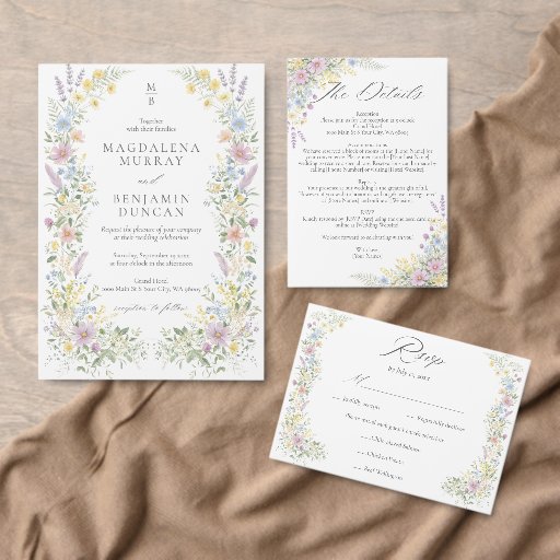 Embrace the charm of a romantic countryside celebration with this elegant watercolor wedding design that features a delicate floral wreath border in vintage Regency style, composed of whimsical wildflowers, including lavender sprigs, soft pink cosmos, and golden yellow daisies, all rendered in a sophisticated pastel palette. The clean, modern serif typography is balanced by a graceful script accent, creating a look that is both timeless and contemporary. This versatile design is perfect for spring or summer weddings, garden ceremonies, or rustic "I do" celebrations.