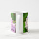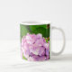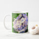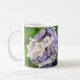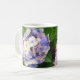 Ein Foto von blauen und violetten Hortensien auf einer Kaffeetasse.
