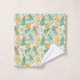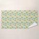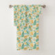 Ein wunderschönes Set mit farbenfrohen Badehandtüchern in Grüntönen und Gelb mit einem pastellfarbenen Muster aus tropischen Muscheln und Palmen.