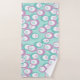 Dieses Handtuch-Set hat ein Badetuch mit einem Muster von verstreuten, türkisfarbenen Ovalen und lila mit weißen Ovalen und Kreise mit Linien im Inneren, ein aquamarines Waschtuch und ein lila Handtuch.