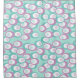Dieser Duschvorhang hat ein Muster verstreuter, türkisfarbener Ovale, lila mit weißen Ovalen und Kreise mit Linien im Inneren.