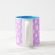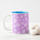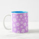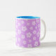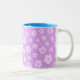 Schöne lila und weiße Blume, zwei farbige Kaffee- und Teezubereiter Tasse mit hellblauer Einrichtung.