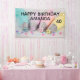 Ein Geburtstagsbanner mit hübschem pastellfarbenem Foto. Die Kuchendekoration ist in Pastellblau, Rosa, Pfirsich und Gelb gehalten. Set auf einem Holztisch mit kleinen bunten Perlen.