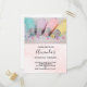 Geburtstagsfeier Einladung Postkarte mit einem hübschen pastellfarbenen Foto. Die Kuchendekoration ist in Pastellblau, Rosa, Pfirsich und Gelb gehalten. Set auf einem Holztisch mit kleinen bunten Perlen. Schön und angenehm.