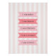 Ein niedliches, mädchenhaftes Design mit der Selbstbestätigung der Liebe "Ich bin freundlich, ich bin mutig, ich bin stark, ich bin fähig, ich bin geliebt" auf einem pastellrosa und weiß gestreiften Hintergrund. Ideal für Kinderzimmer, Büro, Schlafzimmer oder Schlafzimmer.