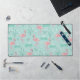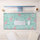 Schreibtischmatte mit einem skurrilen Muster. Pastellrosa Flamingos auf hellgrünem Hintergrund. Grüne Lilienpolster und Lotus-Blume. Niedliches tropisches Flair.
